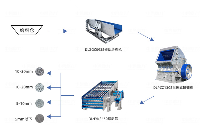 • 主要設(shè)備:振動(dòng)給料機(jī)、重錘式破碎機(jī)、顎式破碎機(jī)、反擊破碎機(jī)、振動(dòng)篩