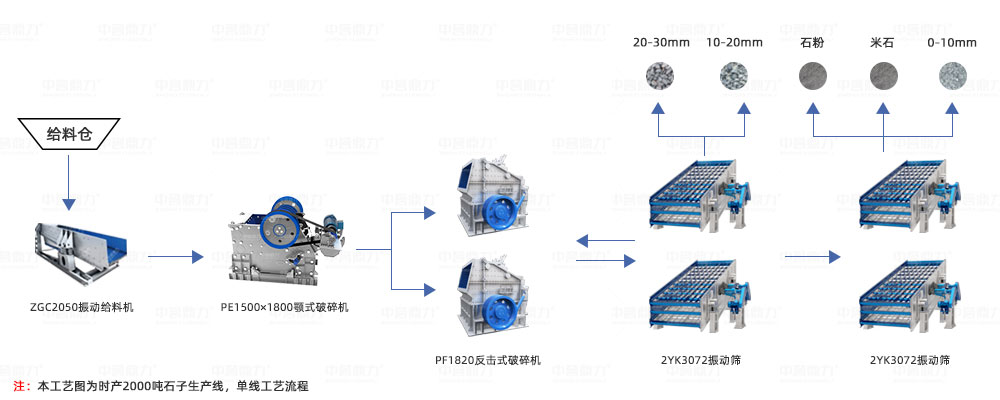 主要設(shè)備配置:DLZGC2050振動給料機2臺+PE1500×1800顎式破碎機2臺+PF1820反擊破4臺+2YK3070振動篩8臺