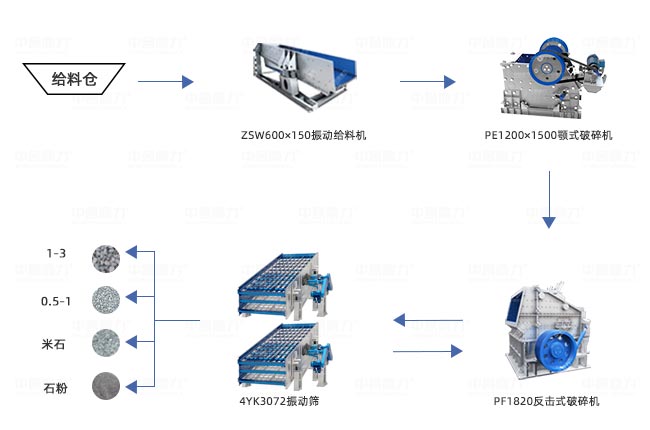 設備配置:ZSW600×150振動給料機+PE1200×1500顎式破碎機+PF1820反擊式破碎機+4YK3072振動篩2臺