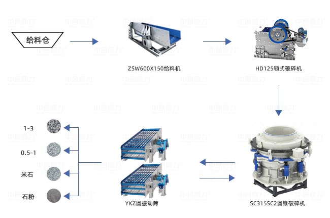 設備配置:ZSW600X150給料機+HD125顎式破碎機+SC315SC2圓錐破碎機+皮帶機