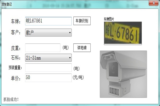 如上圖,操作員點開“貨車登記”對話框后,車牌識別機自動開機抓拍識別,得到的圖片和車牌號都相應的顯示在對話框中。更加提高了車牌輸入的速度,真正體現了軟件操作簡便快捷的特點。