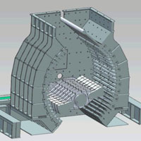 機(jī)殼采用雙腔對稱設(shè)計,可一次性容納更多物料,提高破碎產(chǎn)量,工作時,電機(jī)帶動錘頭高速運(yùn)轉(zhuǎn),對從上方落入的物料形成沖擊力,此時的物料獲得動能后高速撞向機(jī)腔內(nèi)壁的反擊板,造成物料的次破碎,從物料進(jìn)入機(jī)腔便相互碰撞形成自粉碎,物料在多次撞擊、研磨作用下達(dá)到所需粒度,從機(jī)腔側(cè)下方出料口排出,完成破碎過程。